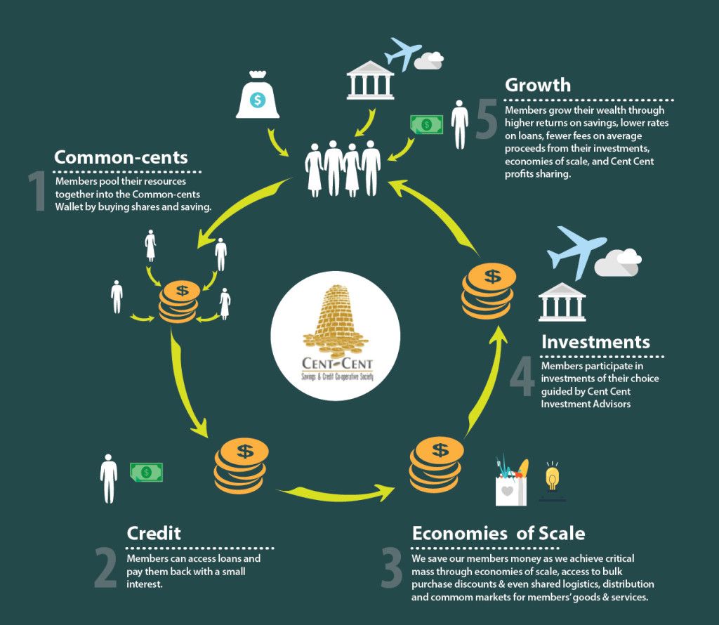 Cent-Cent is a world class, 100% digital, technology driven Savings and Credit Union. It is a member-owned Financial Service Cooperative where members can save money, build capital, access credit and benefit from economies-of-scale such as bulk discounts. Members also learn more about wealth creation. By depositing into the Cent-Cent savings account known as the Common-cents Pool, members pull their financial resource together to create one huge fund. This fund can be used to secure profitable investments that go further and earn more than is individually possible. Since all members are shareholders, all members have a share in the profits.